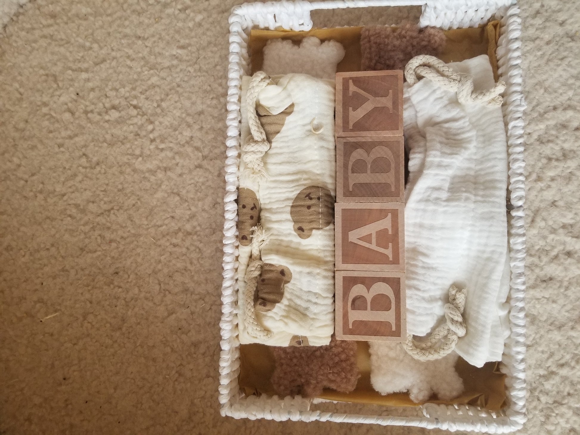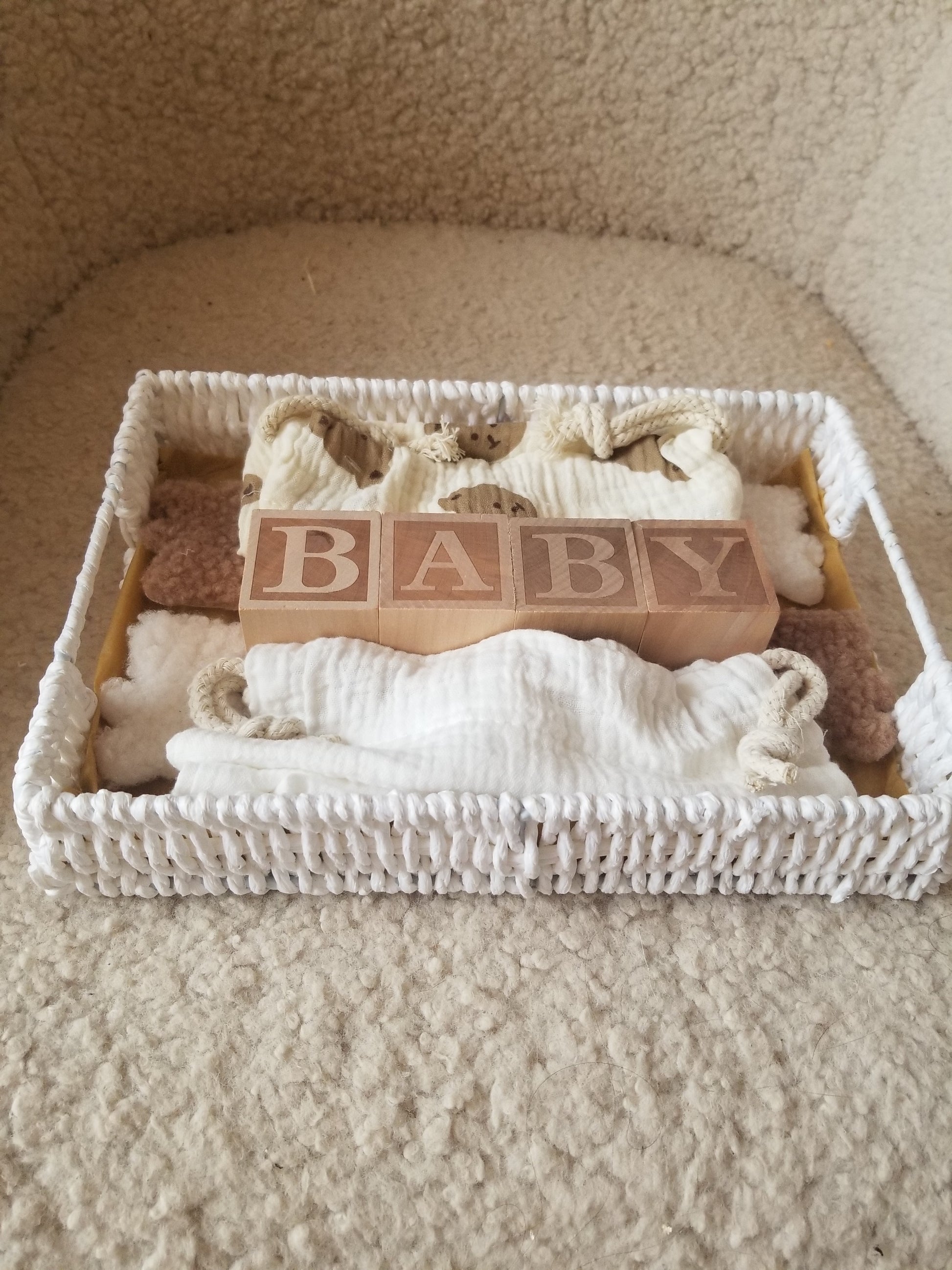 deco#cadeaupourbebe#corbeillerectangulaireblanche#cubesbaby#deuxsacsderangement#patchsenmousse#papierdesoie