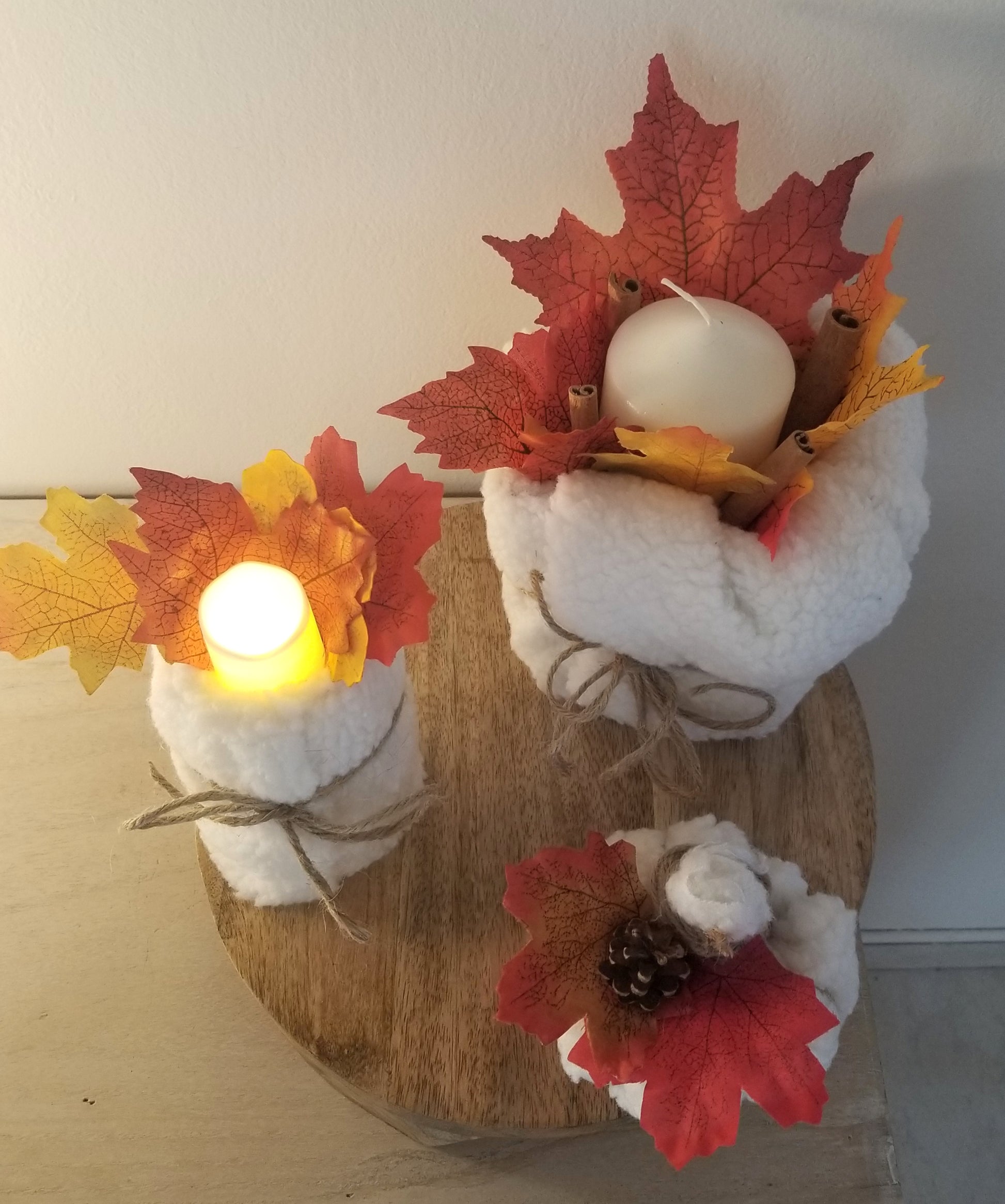 deco#vaseverre#potverrre#tissulai e#feuillesorangees#cordelette#bougie#pommedepin