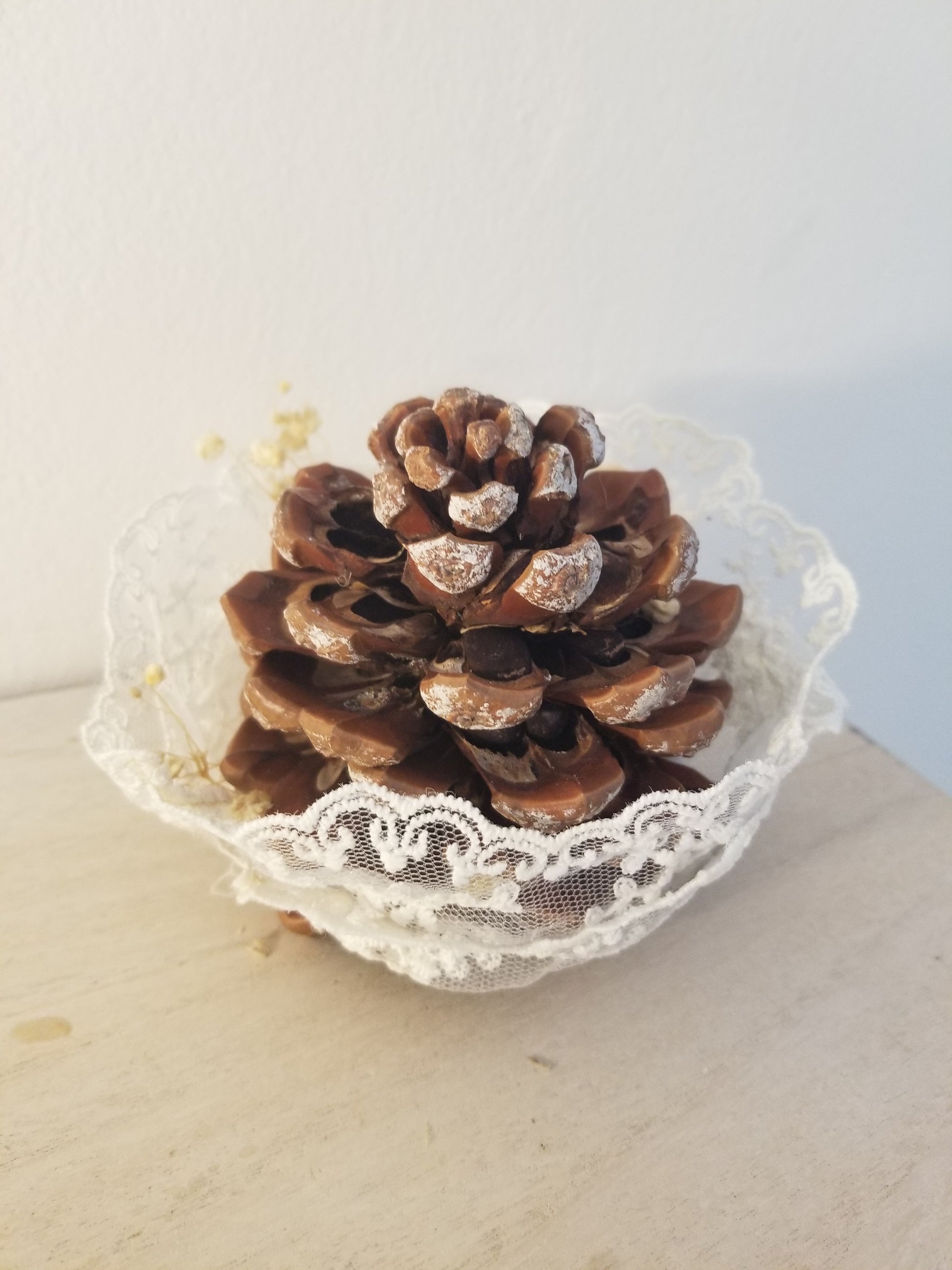 deco#pommedepinnaturelle#gypsophile#ribanendentelle