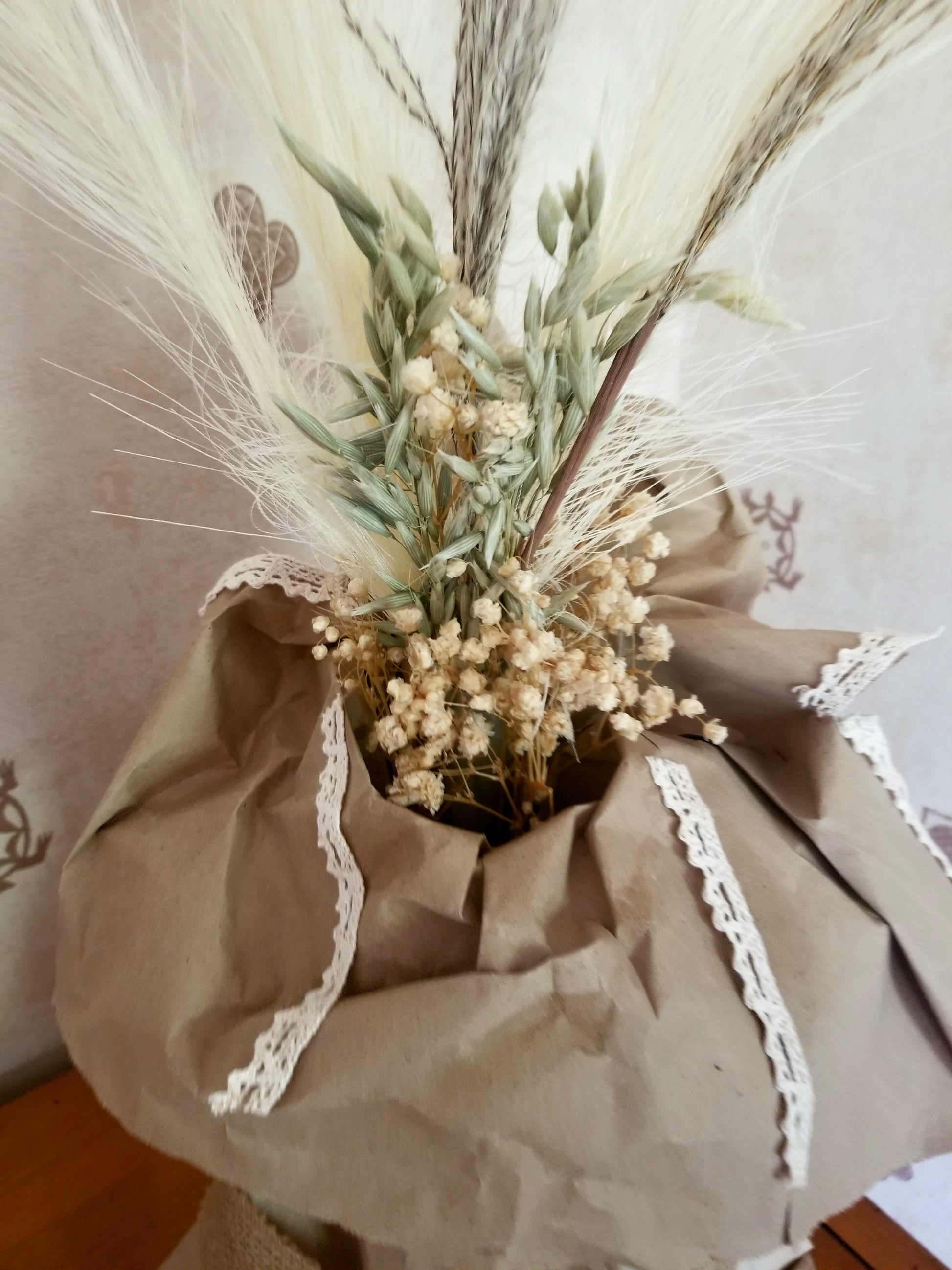 deco#sackraft#bouteilleverre#ble#pampas#gypsopgile#rubantoiledejute#dentelle#cordelette