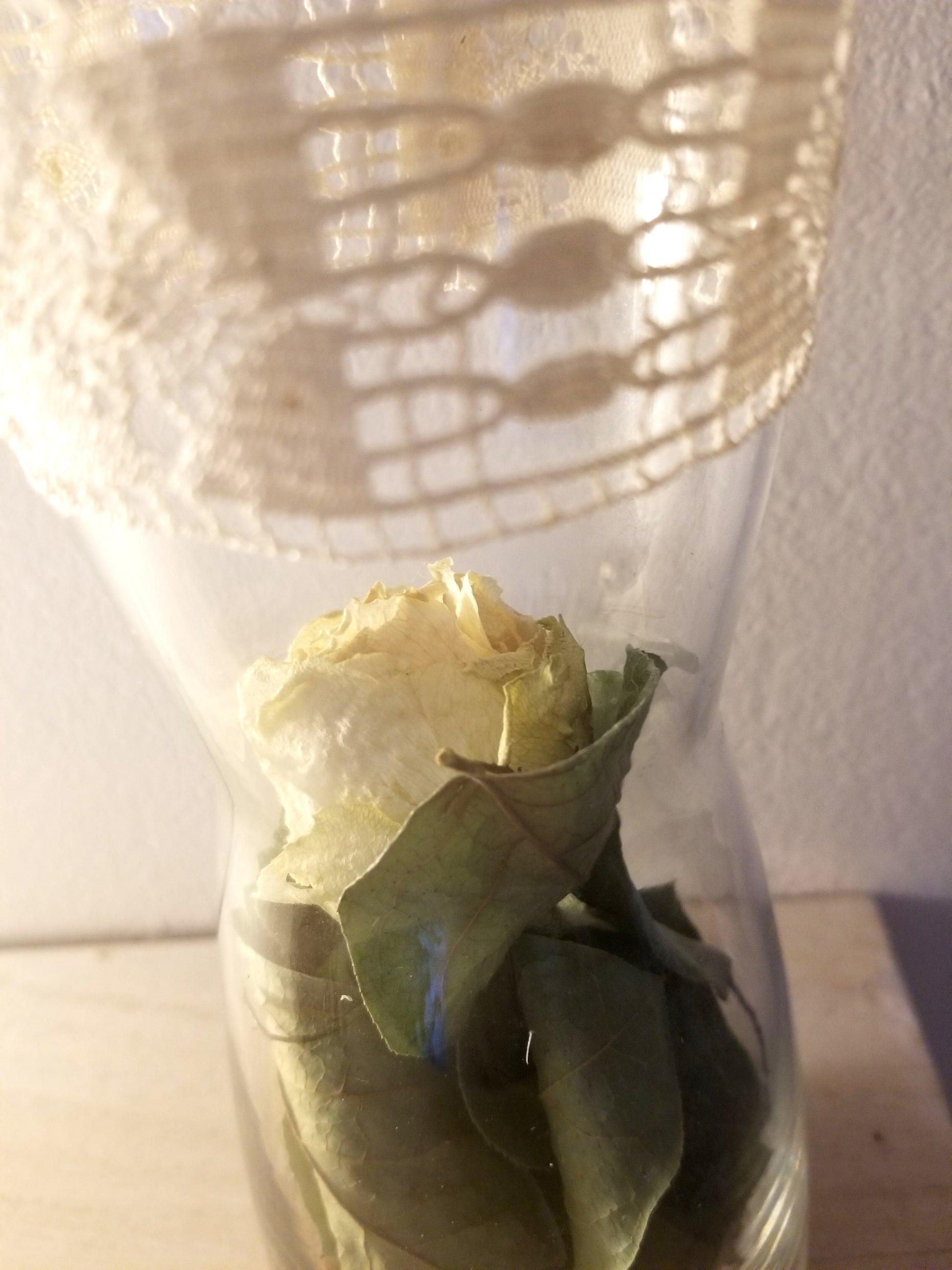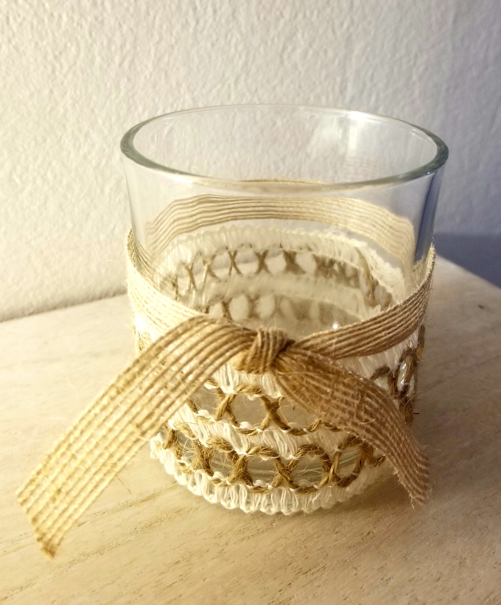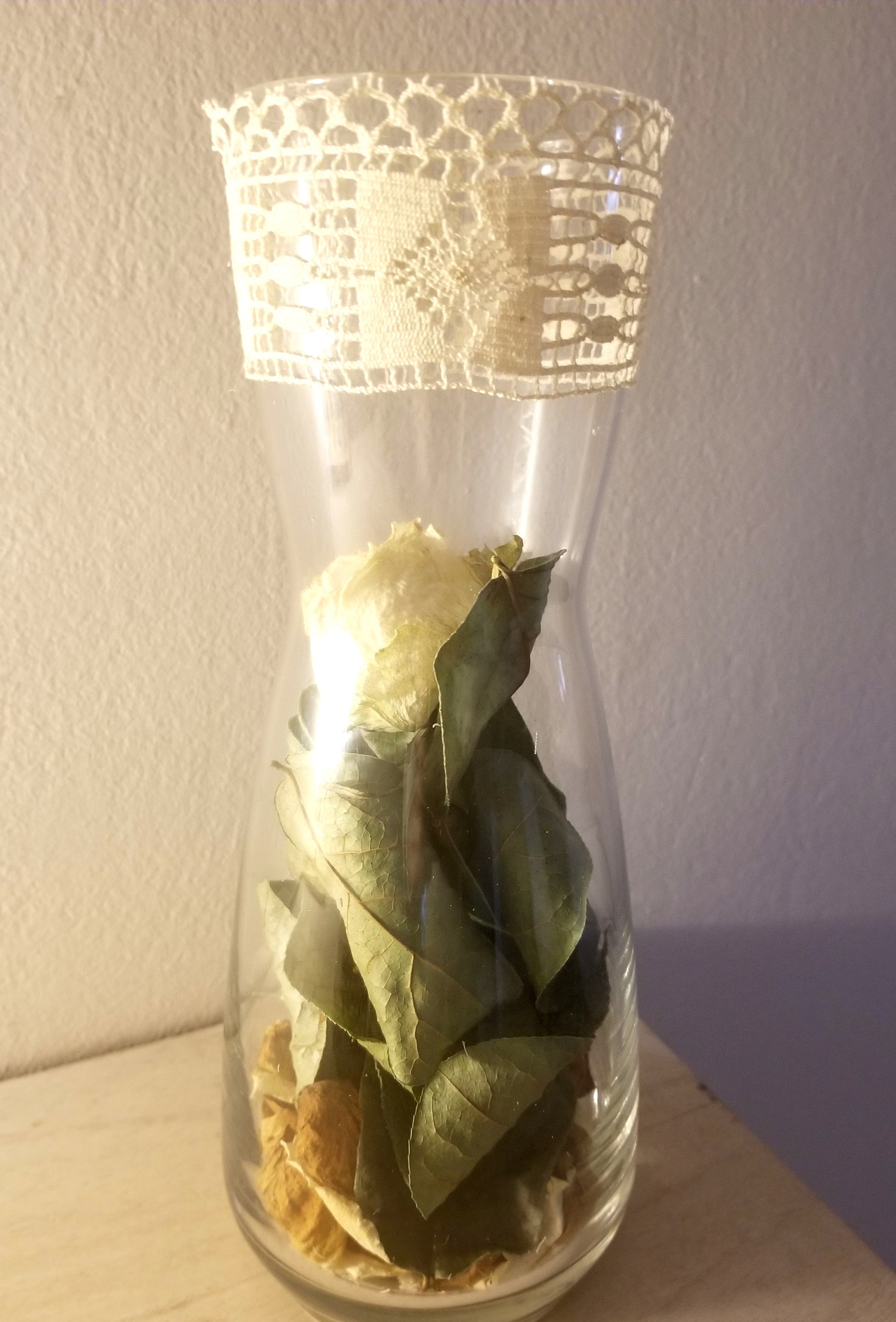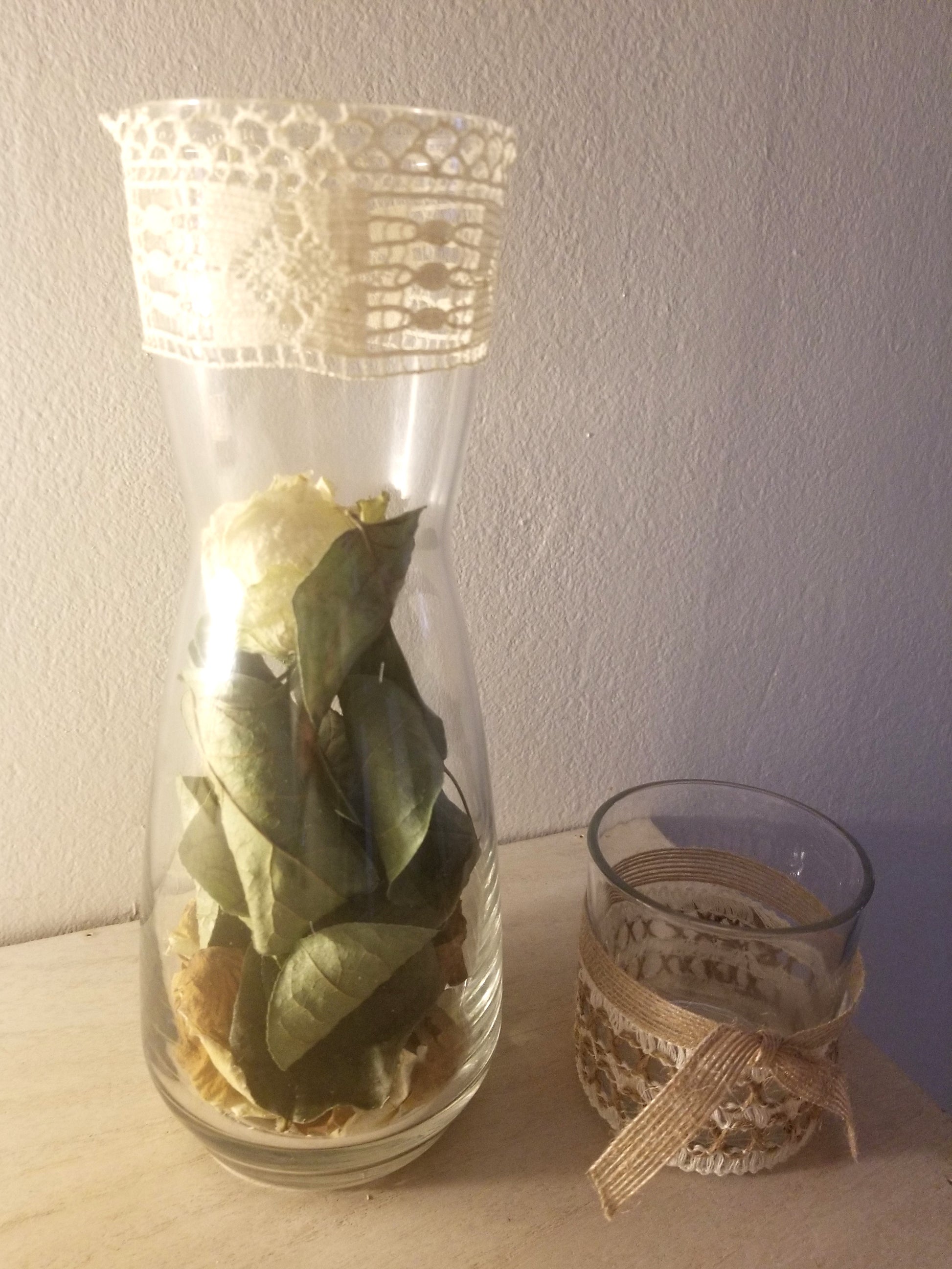 deco#vaseetphotophore#dentelle#rubanencordelette#rosenaturelleavecqesfeuillesetsespetales